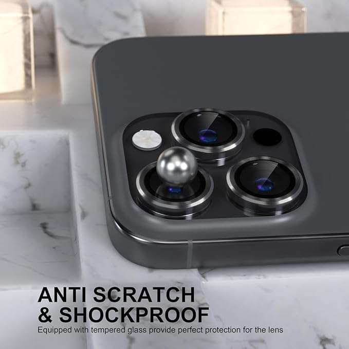 About this item Full Protection: The aviation tempered glass metal ring and 9H tempered glass camera protector shields your camera lens from drops, bumps and scratches. The seal ring also guards your lens from water, oil and dust for superior protection. Anti-Reflection Technology: The protector is designed with a fusion of anti-reflection technology and augmented reality to ensure that the quality of your camera remains untouched. Excellent Clarity: With its high-quality absorption technology and strong adhesion, the lens prevents the formation of air bubbles. Further, the glass minimizes stains from fingerprints and smudges to ensure excellent clarity. Effortless Installation: The tempered glass protector is easy to install and adheres firmly onto your camera lens. For further guidance, you can also watch the provided video for a seamless and effortless installation. Stylish Design: Features a sleek finish, making it a stylish accessory for your phone. Model Compatibility: This rear camera lens protector is designed specifically for the iPhone 16 Pro Max.